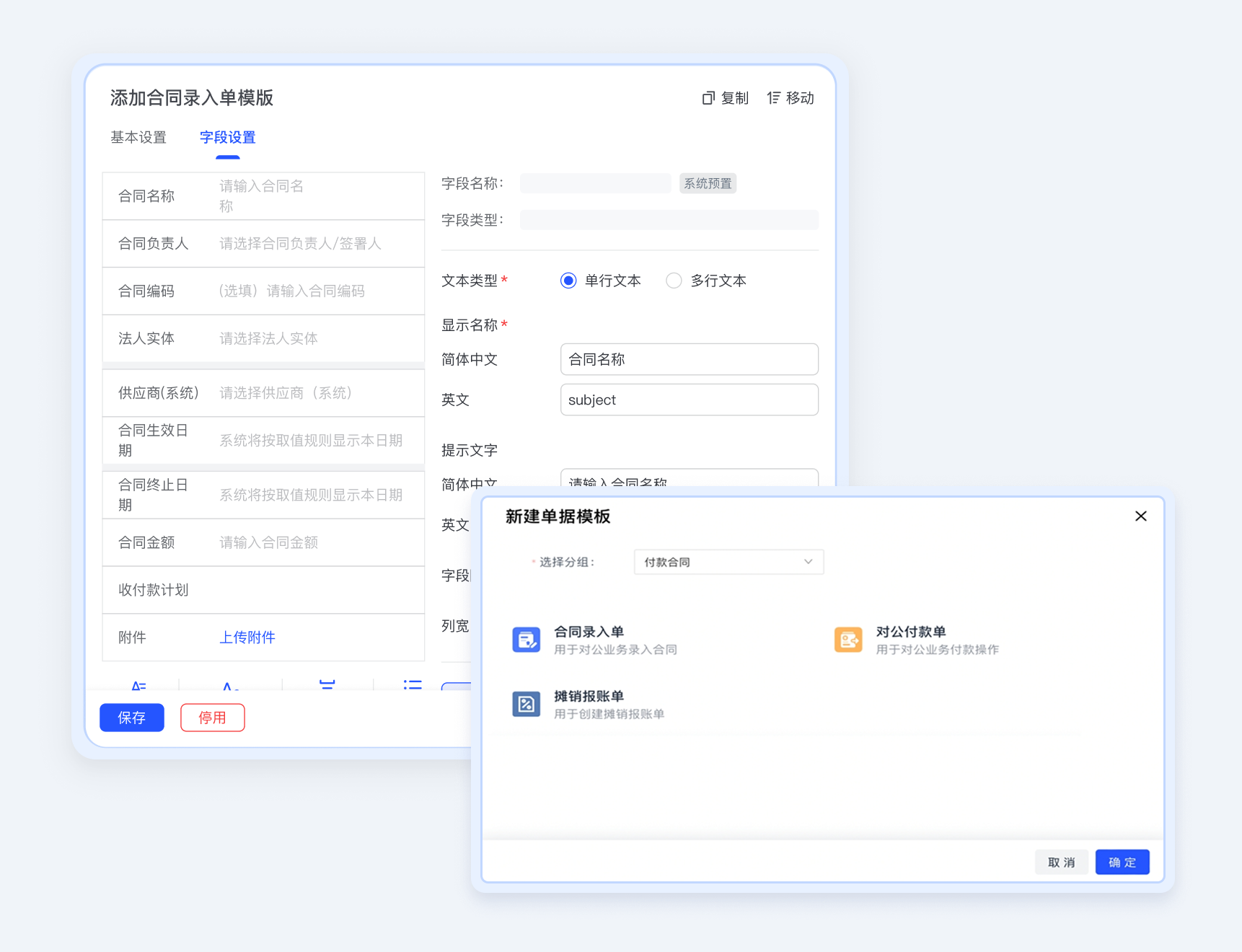 支持自定义合同模板字段,分类管理合同信息,多维度动态展示合同信息,支持多维度组合查询合同收付款情况、发票情况、关联报账情况等信息。