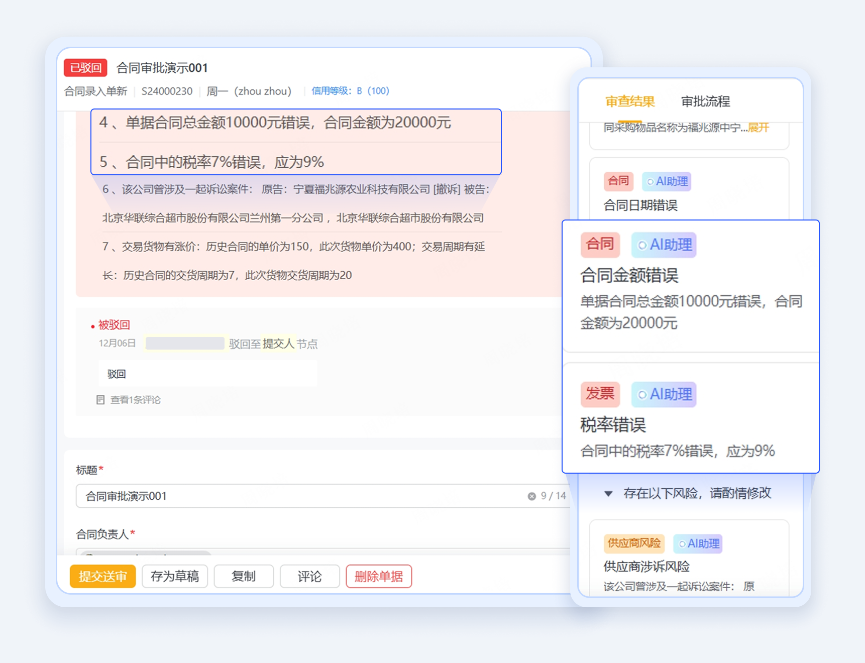 快速定位合同中的关键条款,并结合相关法律法规和企业内部政策,对合同风险进行评估,提醒企业关注潜在风险。