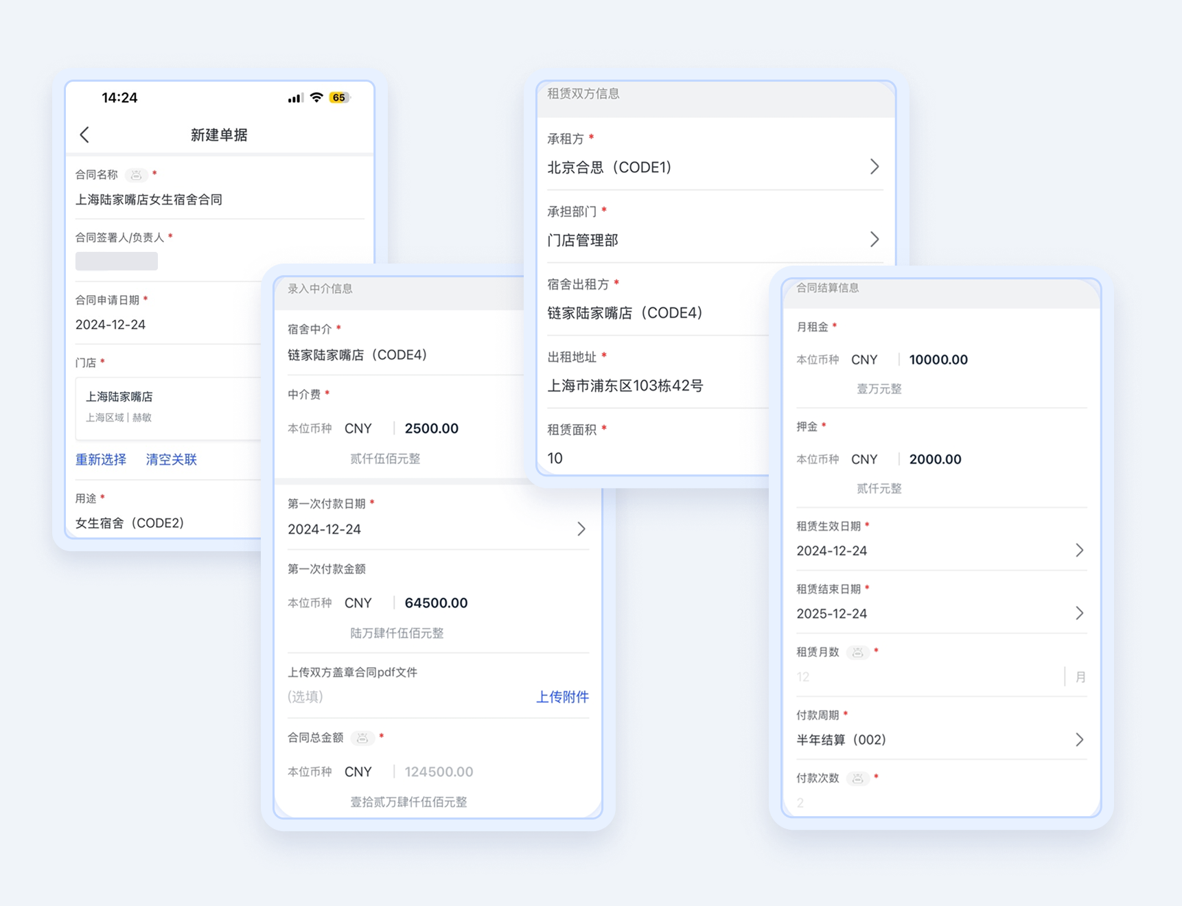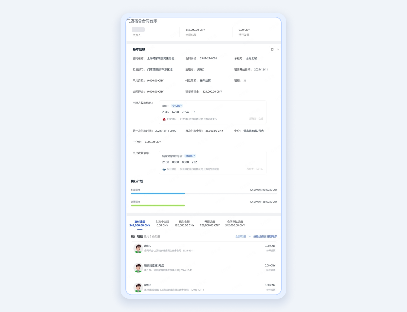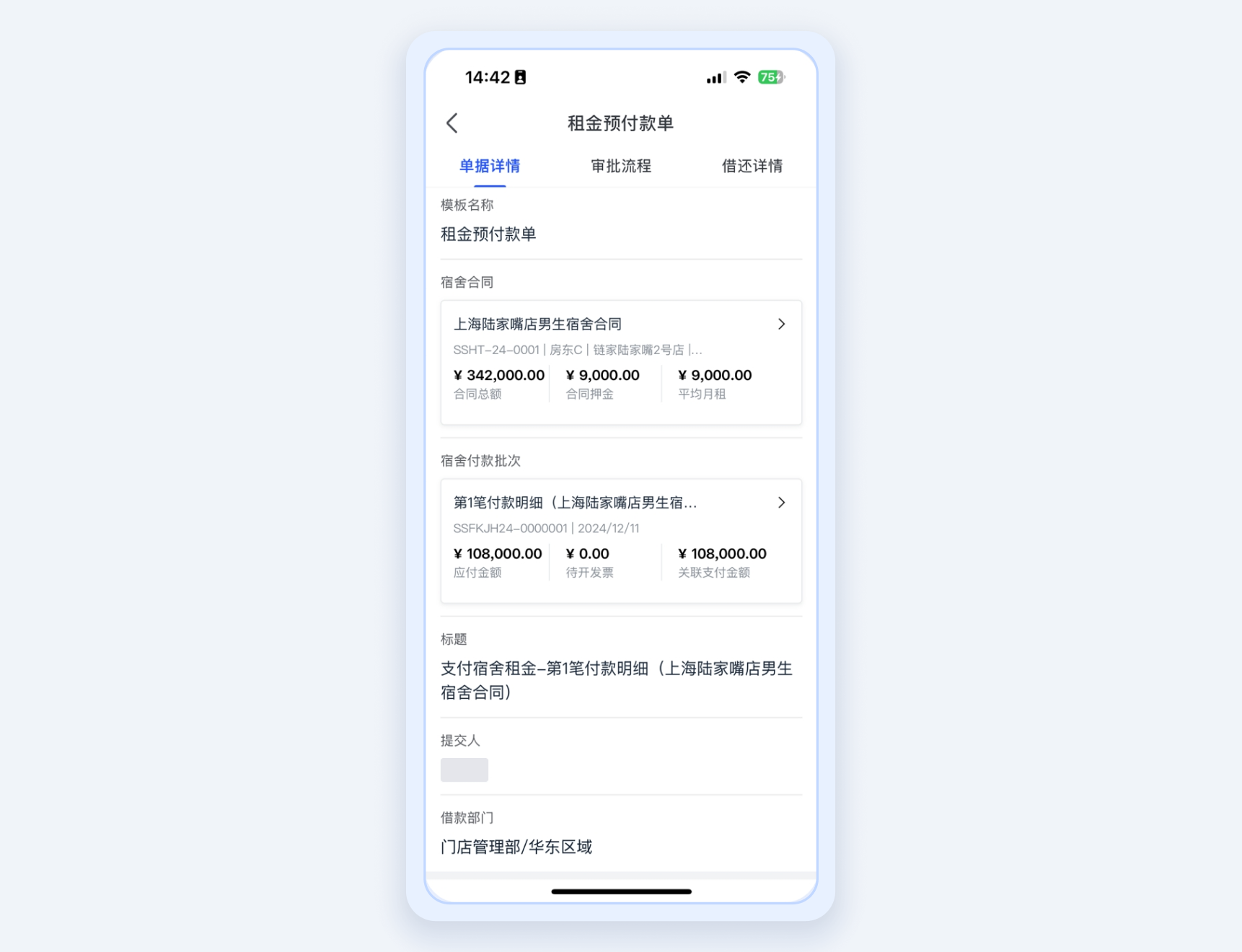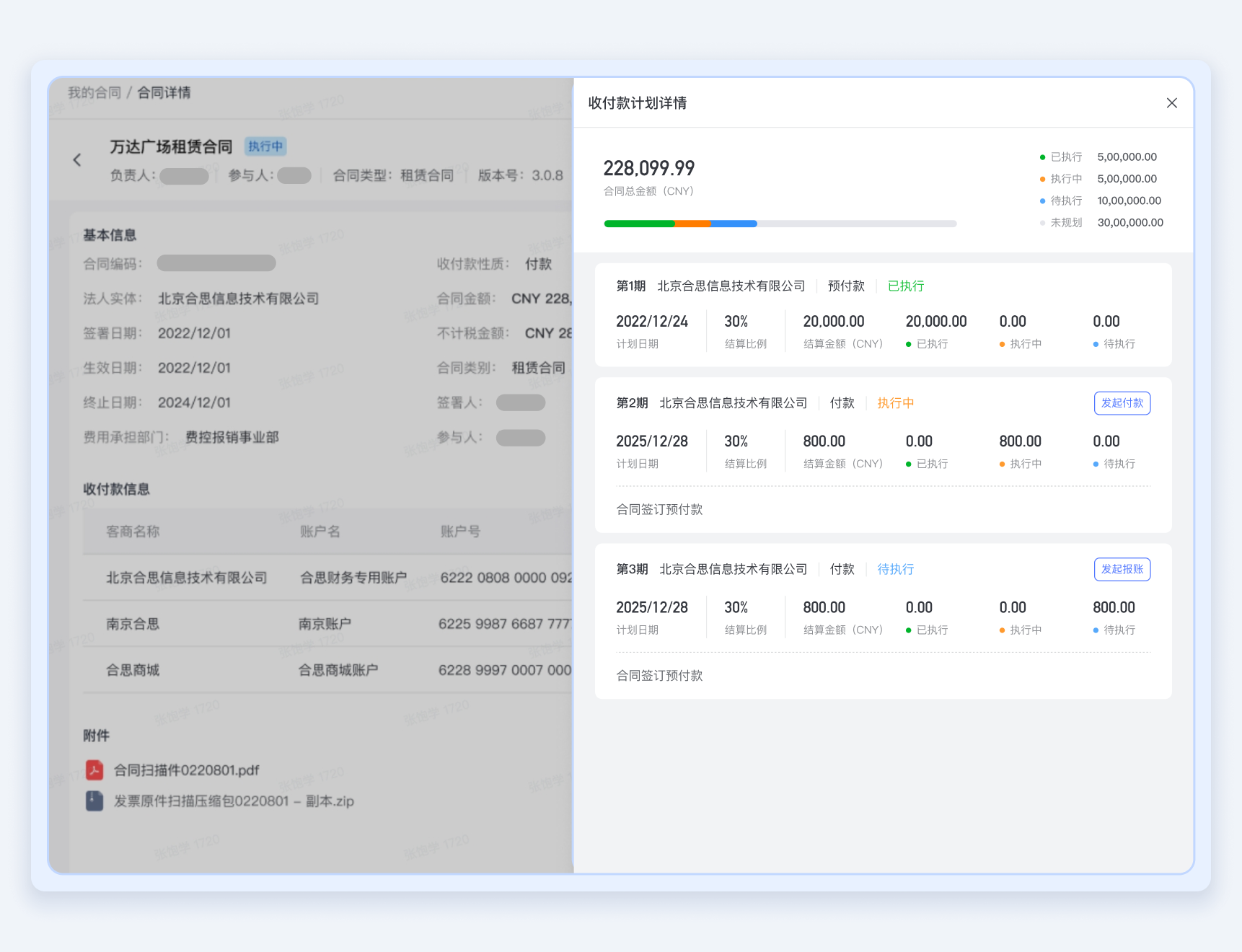 合思系统内自动拆分付款计划、定时发起付款,单据内可查看宿舍合同详情及付款批次,提高审批效率。