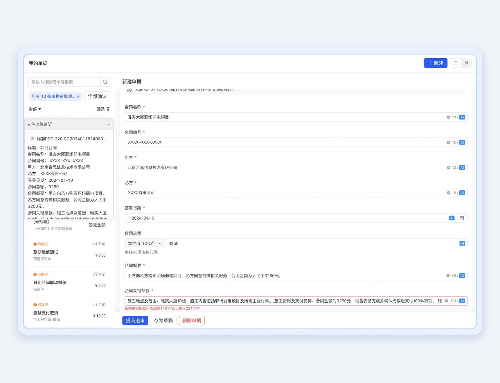 自动识别合同名称、合同编号、甲方乙方、签署日期、合同总额、合同概要、合同关键条款等信息,自动填充至单据,一键式自动填单。