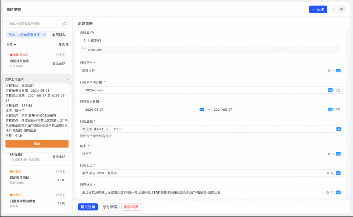 • 无论是合同填单还是费用报销,都能做到智能化识别附件、总结式提取内容、自动化填写信息,告别手忙脚乱,化繁琐为高效
