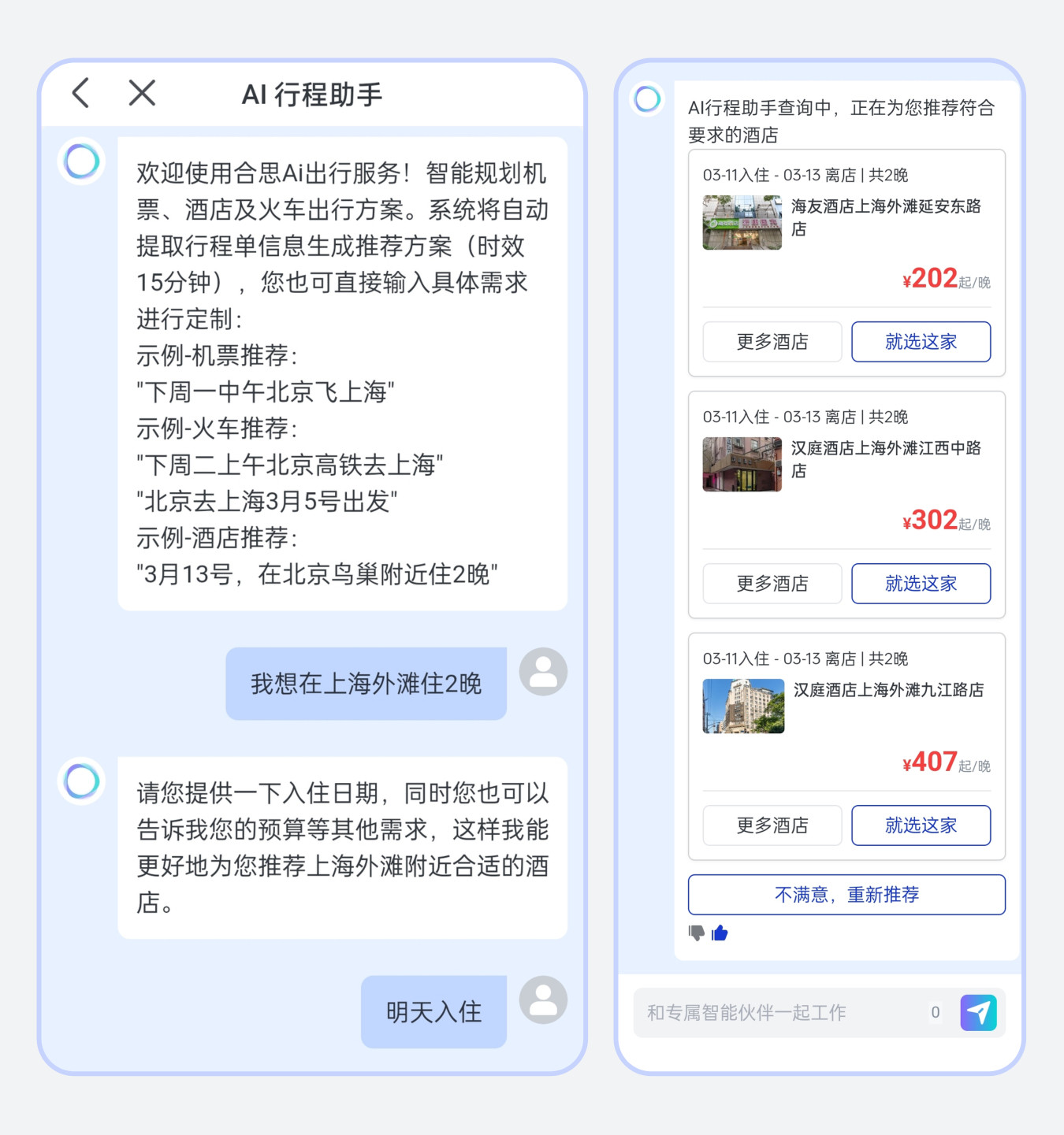 • 行程AI助手通过智能算法实现个性化推荐,提供全面的覆盖范围,能够满足多样化的出行需求,帮助用户高效完成合规差旅规划。