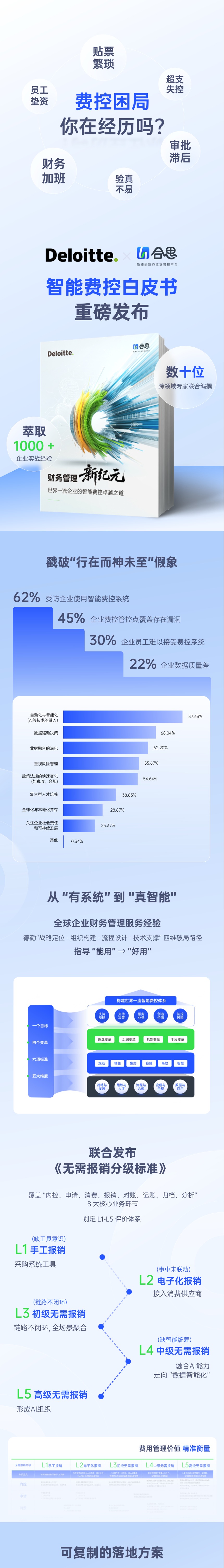 9月26日,由合思主办、德勤战略支持的「AI在当下 | 2025未来财务人大会」上,将重磅首发德勤与合思联合推出的《财务管理新纪元:世界一流企业的智能费控卓越之道》白皮书,该白皮书发布新时代全新无需报销分级标准,为企业提供清晰的智能费控实施路径与战略地图,助力企业迈向世界一流财务管理体系。